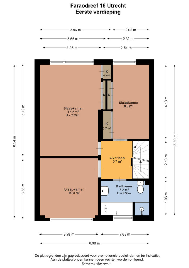 Drie ruime slaapkamers (17, 11 en 8 m²), waarvan de slaapkamers aan de achterzijde zijn voorzien van handige ingebouwde kasten. De badkamer is compleet met douche, ligbad, wastafel en toilet. Een vaste trap leidt naar de tweede verdieping.