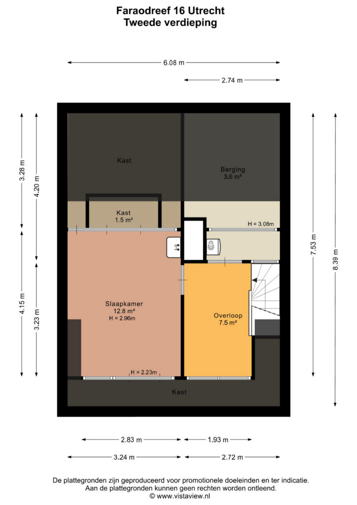 Landing with additional storage space and central heating boiler, plus a large bedroom of 13 m² with a dormer at the front and storage space behind the knee walls. There is also the possibility of creating an additional bedroom.