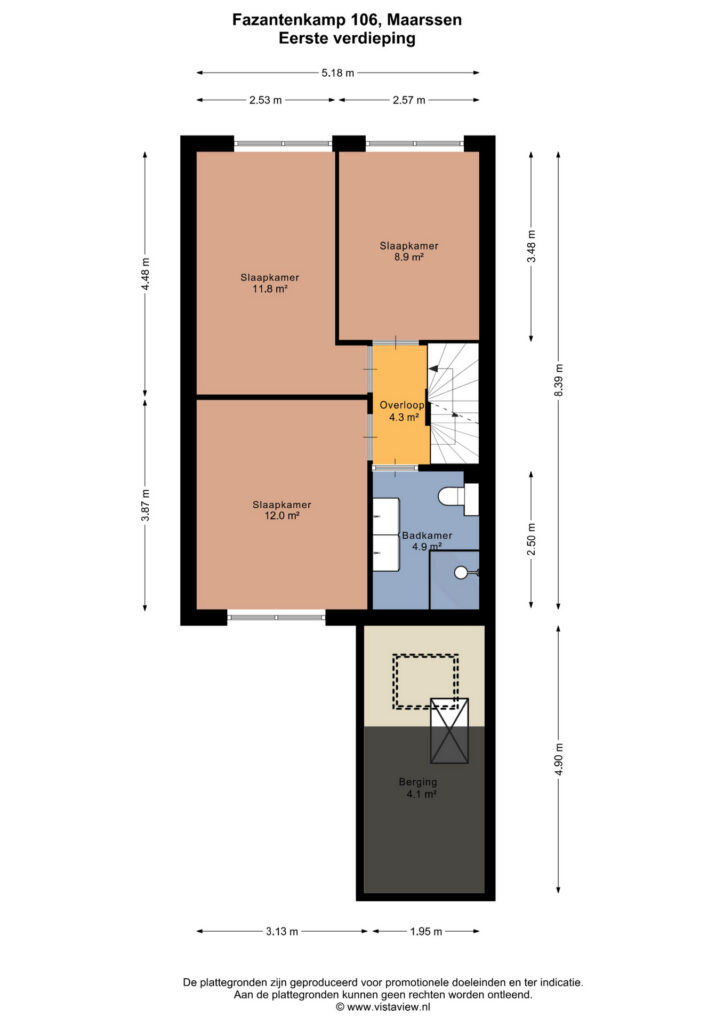 Eerste verdieping: Via de trap kom je op de overloop. De overloop biedt toegang tot 3 slaapkamers en de badkamer. De grootste slaapkamer (12m²) ligt aan de voorzijde en biedt voldoende plek voor een tweepersoonsbed en een kastenwand. De 2e slaapkamer (11,8m²) is ook van goed formaat en ligt aan de achterzijde met uitkijk op veel groen. De 3e slaapkamer (8,9m²) ligt aan de achterzijde en is een ideale werk-/kinderkamer. De moderne badkamer (2020) beschikt over een dubbele wastafel, inloopdouche en 2e toilet.