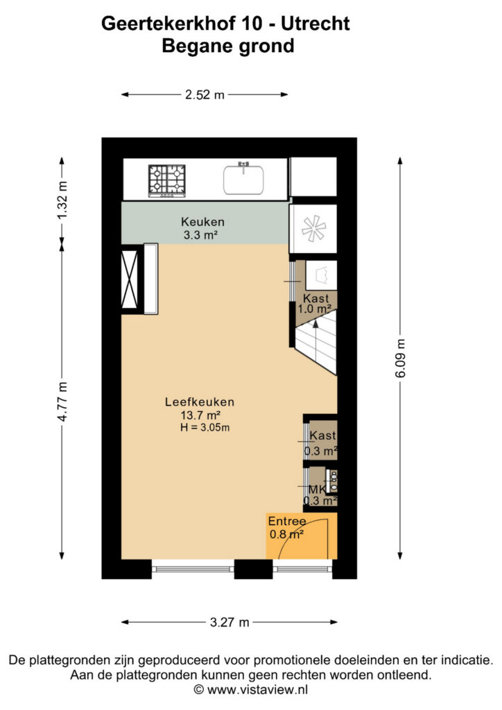 Een open trap leidt naar de eerste verdieping; onder de trap bevindt zich handige bergruimte en de wasmachine aansluiting.