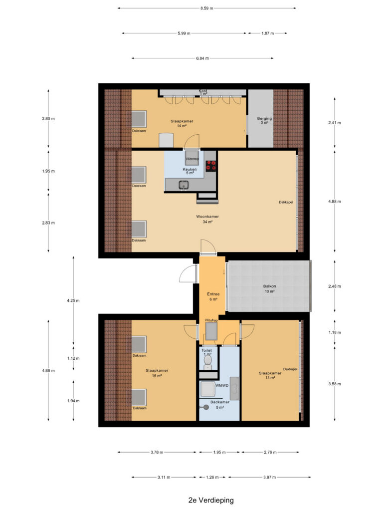 Vanuit de centrale hal zijn aan de rechterzijde de overige twee slaapkamers, de badkamer en het toilet bereikbaar. De slaapkamers hebben beide een mooi formaat: 13 en 15 m². De badkamer beschikt over een inloopdouche, wastafelmeubel en een wasmachineaansluiting.