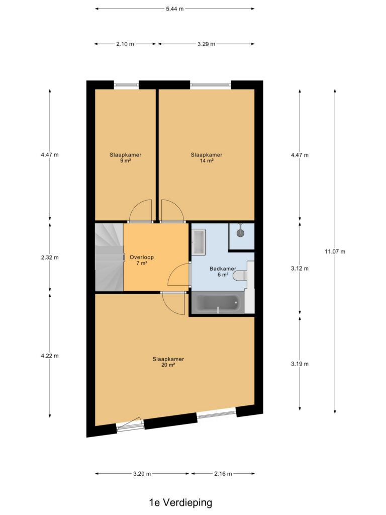Op de eerste verdieping bevinden zich drie volwaardige slaapkamers van 20, 14 en 9 m² die stuk voor stuk een prettige indeling en goede lichtinval hebben. De grootste slaapkamer aan de voorzijde is zeer ruim waardoor deze, als gewenst, kan worden opgesplitst in twee afzonderlijke kamers. Het aanwezige Franse balkon geeft de ruimte een mooie open uitstraling. Aan de achterzijde bevinden zich twee slaapkamers die zijn voorzien van elektrische rolluiken, wat niet alleen bijdraagt aan comfort en verduistering, maar ook aan een aangenaam binnenklimaat.