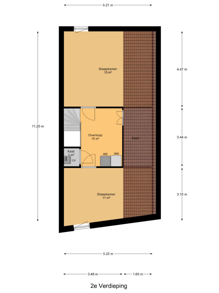 De tweede verdieping verrast direct door de hoeveelheid ruimte. Hier zijn nog twee ruime slaapkamers van ca. 15 en 11 m² aanwezig die zich uitstekend lenen als slaap- of werkkamer. De overloop van ca. 10 m² biedt onder andere plaats aan de witgoedaansluitingen. In een separate vaste kast bevindt zich de technische installatie met de cv ketel en de hybride warmtepomp. Dit maakt deze verdieping zeer functioneel en klaar voor de toekomst.