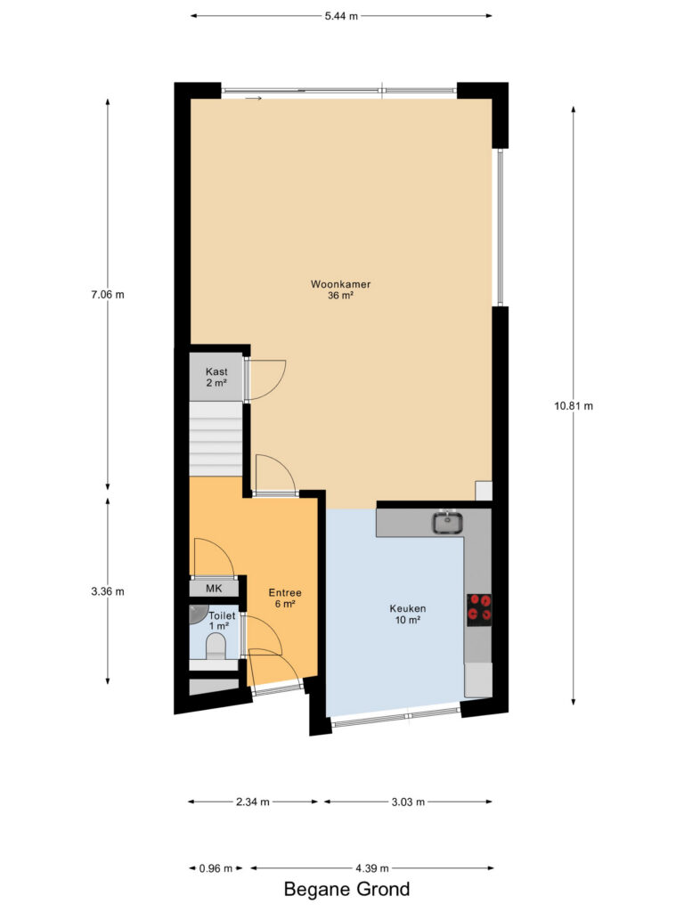 Aan de voorzijde bevindt zich de halfopen keuken met zicht op de voortuin. Deze keuken is compleet en praktisch ingericht met onder andere een inductiekookplaat (ca. 2015), combi oven en vaatwasser (2020) en biedt voldoende werk en opbergruimte. Dankzij de royale lengte van de gehele begane grond (ca. 10,8 m) voelt deze verdieping bijzonder ruimtelijk aan en is er voor ieder gezinslid een fijne plek te vinden.