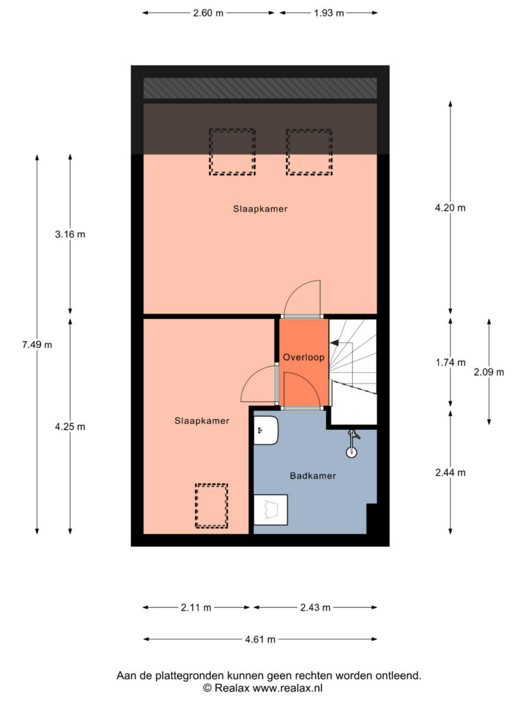 Twee goed bemeten slaapkamers van circa 9 en 14 m² groot. De grootste kamer ligt aan de achterzijde van het appartement en is voorzien van dakramen. De badkamer is ook prettig ruim: circa 6 m². De badkamer is voorzien van een wastafel, douche en hier bevindt zich de wasmachine-aansluiting.