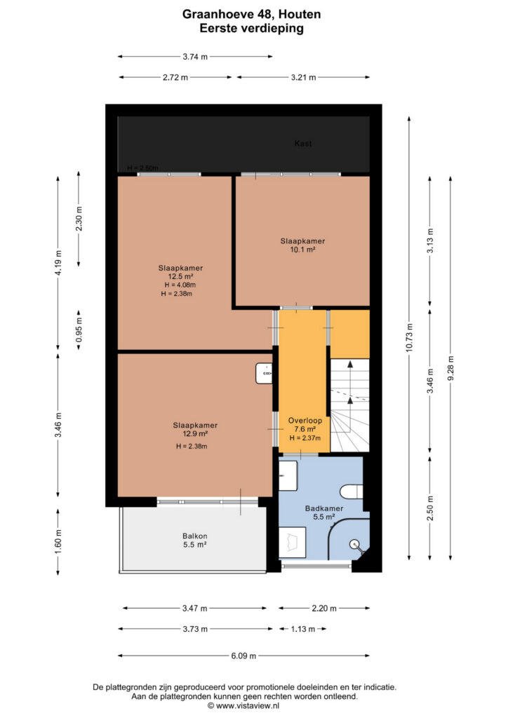 Upstairs you’ll find three spacious bedrooms. The front bedroom even has access to a private balcony—a lovely place to start your day on a warm summer morning. The modern bathroom includes a walk-in shower, a second toilet, and a washbasin with vanity unit. The washing machine is also conveniently located in the bathroom.