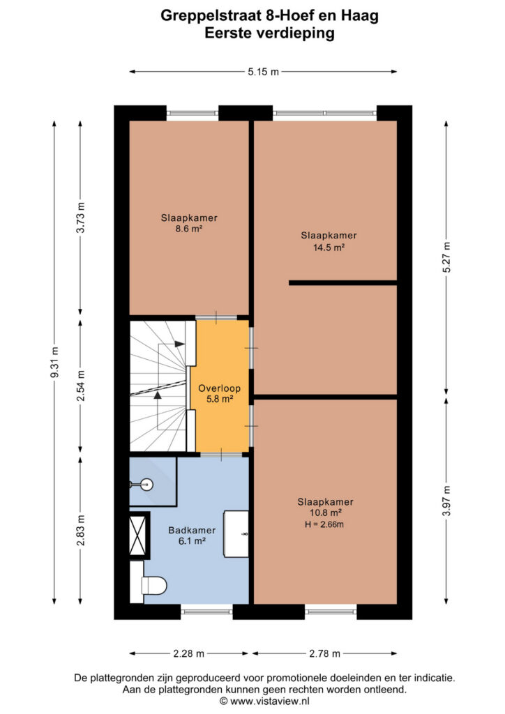 De overloop geeft toegang tot drie slaapkamers van ca. 15, 11 en 9 m² en een moderne badkamer van ca. 6 m². De grootste slaapkamer ligt aan de achterzijde en beschikt over een ruime inloopkast.