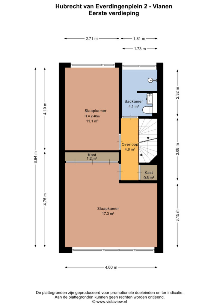 The landing provides access to two spacious bedrooms of approximately 17 m² and 11 m², the bathroom, and a practical storage cupboard. The largest bedroom includes a built-in wardrobe and, if desired, can be divided into two rooms. Both rooms are well-sized and easy to furnish.