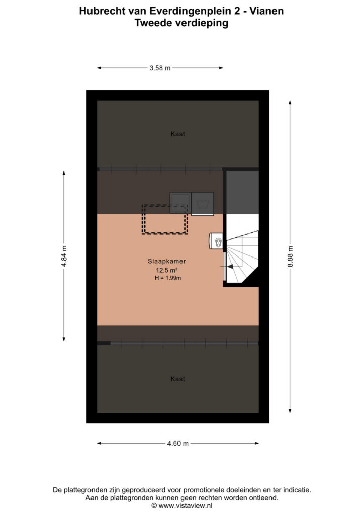 This floor has a usable area of approximately 15 m² (measured from 1.5 meters height). Due to a limited head height of 1.99 meters, it does not fully meet the NEN2580 standard for official living space (minimum 2 meters), but thanks to the fixed staircase and practical layout, it is included in the stated living area.