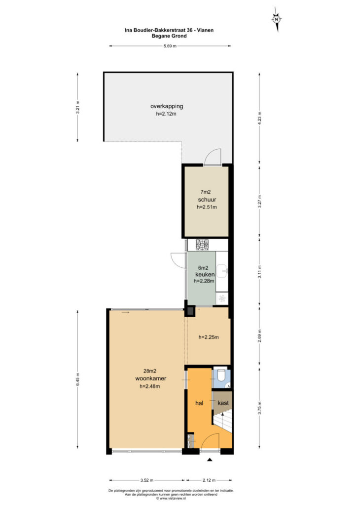 Via de hal kom je binnen in de woning. Vanuit hier zijn de meterkast, het toilet, een provisiekast, de trapopgang en de woonkamer bereikbaar. De woonkamer is een lichte en aangename ruimte van circa 28 m² dankzij de grote raampartijen en de kunststof schuifpui aan de achterzijde. Door de breedte van ongeveer 5,7 meter aan de achterzijde is de ruimte op meerdere manieren in te delen, met aan de voorzijde plaats voor een zithoek en aan de achterzijde ruimte voor een eettafel.