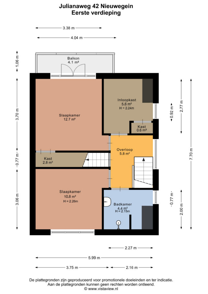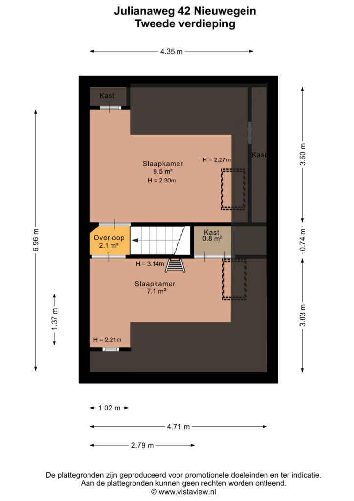 Overloop met twee slaapkamers van ca. 9 en 10 m², beide voorzien van een dakkapel. De kamer van 9m² heeft bovendien een ruime vide, die zorgt voor veel extra opbergruimte.