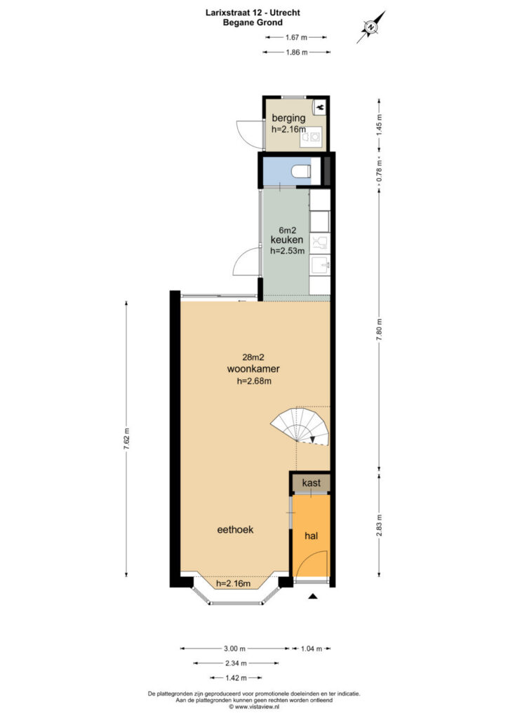 Grenzend aan de woonkamer ligt de halfopen keuken, voorzien van diverse inbouwapparatuur en volop werk- en opbergruimte. Achter de keuken bevindt zich het separate toilet.