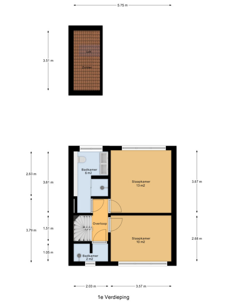 Twee ruime slaapkamers van circa 10 en 13 m². Op deze verdieping bevinden zich ook twee badkamers. De luxe badkamer aan de achterzijde van de woning is fraai afgewerkt en voorzien van stijlvolle tegels, een dubbele wastafel, douche en toilet. De tweede badkamer beschikt over een designradiator en een douche. In beide badkamers is veel natuurlijk daglicht dankzij de ramen.