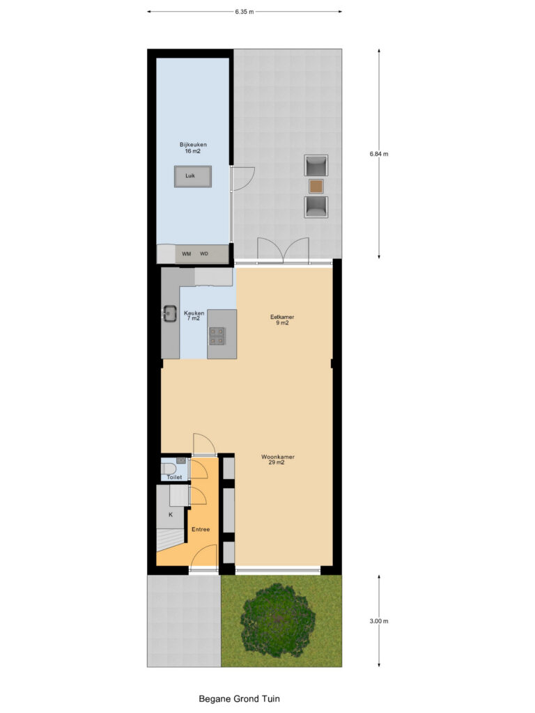 In de tuin bevindt zich de multifunctionele ruimte met een grote raampartij, elektra, water en verwarming. Hier bevinden zich ook de aansluitingen voor de wasmachine en droger. De buitenzijde van dit gebouw is uitgevoerd in kunststof. De tuin is voorzien van een achterom. Op de kleine zolder is de omvormer aanwezig.