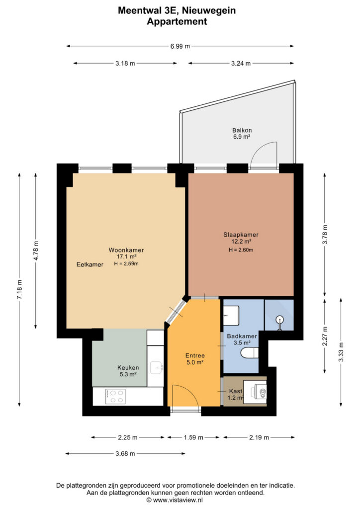 Entree, vaste kast met wasmachine-aansluiting, badkamer en toegang tot de woonkamer en slaapkamer. De badkamer is circa 3.5 m² groot en is voorzien van toilet, douche en wastafelmeubel. De kleurstelling is zwart-wit met een houtlook wastafelmeubel. De slaapkamer is lekker ruim (circa 12 m²) en vanuit de slaapkamer bereik je het balkon. Met circa 7 m² groot is het fijn zitten op het balkon en is er ruimte voor een eettafel buiten. De woonkamer en keuken zijn samen circa 22 m² groot. Door het gehele appartement ligt er een mooie vloer en zijn de wanden en het plafond glad gestuct. De keuken is handig ruim van opzet en is voorzien van inbouwapparatuur. Met de witte kastjes met houtlook werkblad is het een aangename en stijlvolle kleurstelling. Door de grote raampartijen is er veel natuurlijk daglicht.