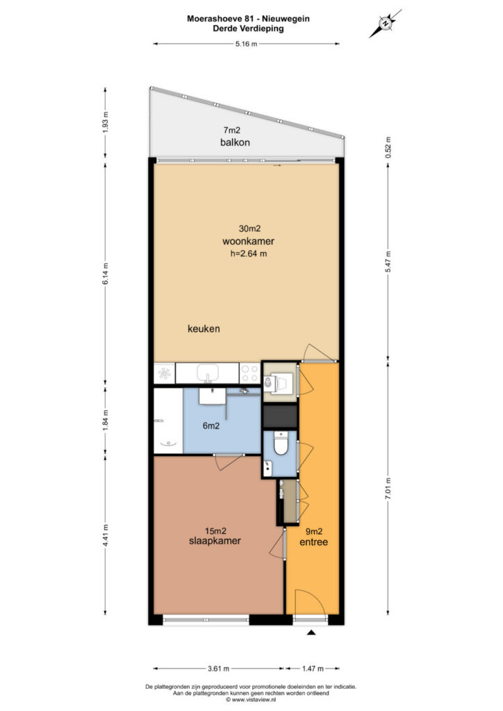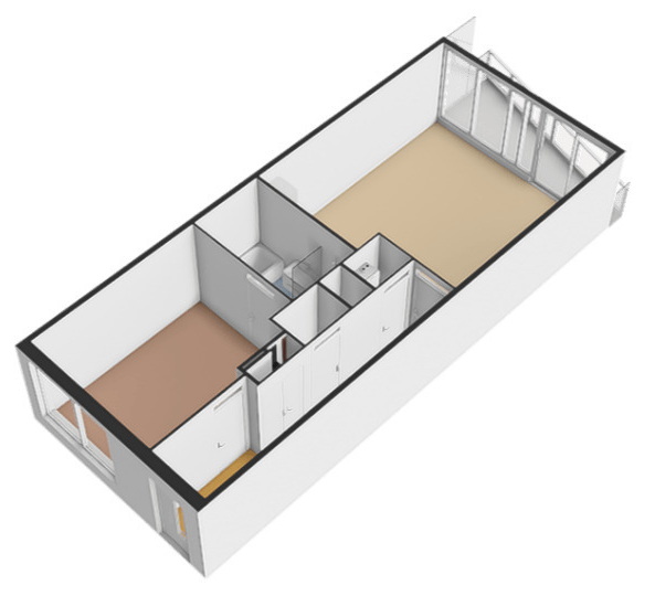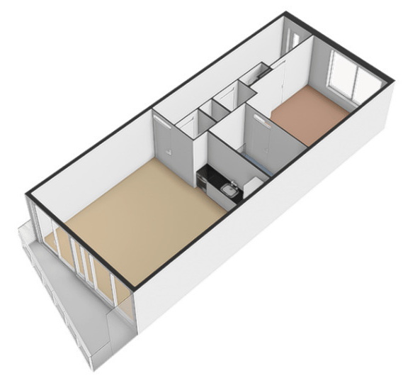 De slaapkamer ligt aan de rustige galerijzijde en is circa 15 m² groot.