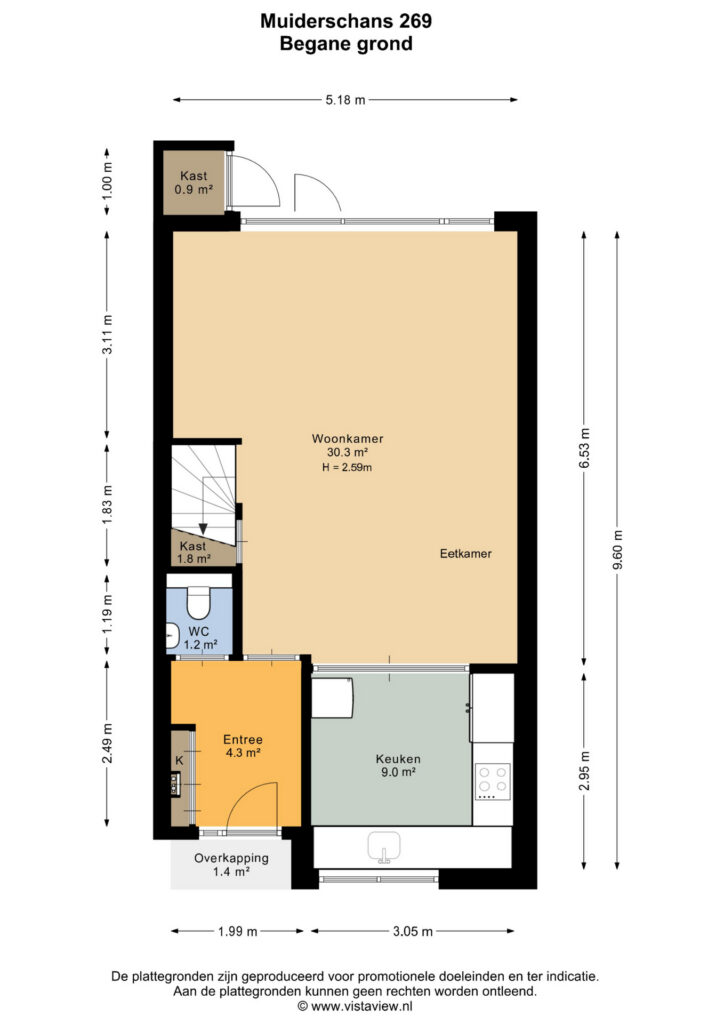 De kamer is ruim 30 m² en heeft een lichte tegelvloer en een trapkast.