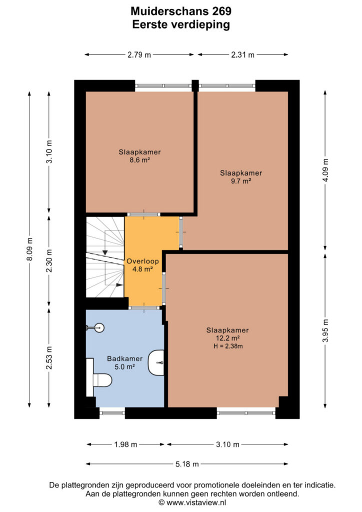 Overloop met toegang tot de drie ruime slaapkamers: respectievelijk 9, 10 en 12 m². De badkamer is voorzien van een wastafel, tweede toilet en een ligbad (met douche).