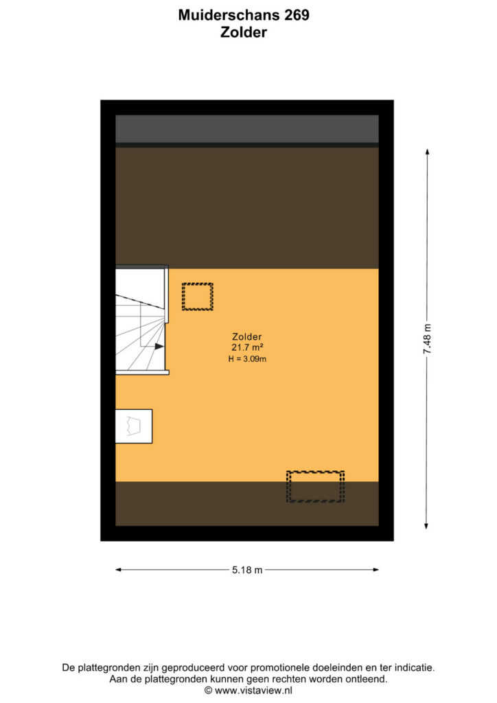 Ruime open zolderverdieping van 22 m². Deze ruimte heeft twee dakramen en is eventueel in te richten als met een voorzolder en een of twee slaapkamers.