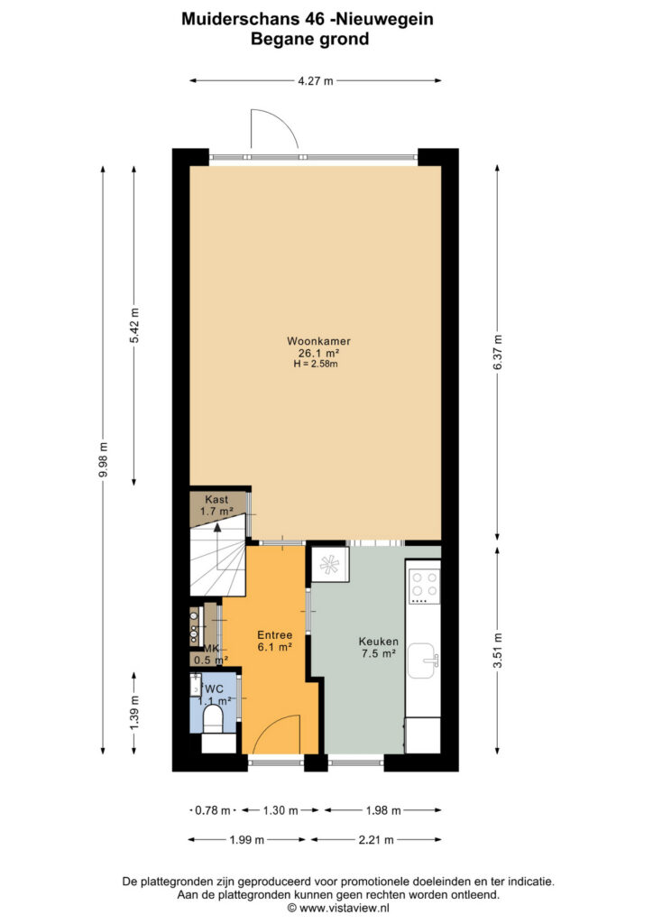 Ruime voortuin van circa 16 m² groot. Entree, vernieuwd toilet met wastafel, meterkast. De woonkamer is circa 26 m² groot en is tuingericht. De keuken is halfopen ten opzichte van de woonkamer en ligt aan de voorzijde van de woning. De kleurstelling is modern en fraai gekozen.