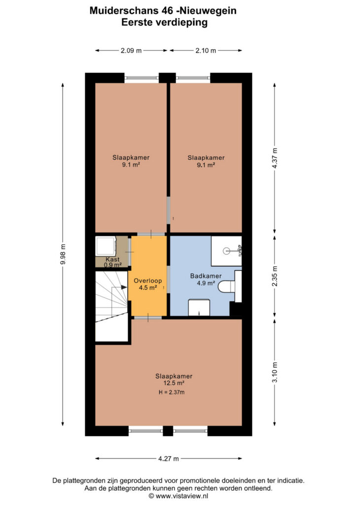 Op de eerste verdieping zijn de houten kozijnen vervangen voor kunststof kozijnen met HR++ glas. Drie ruime slaapkamers van 9, 9 en circa 13 m² groot. Twee slaapkamers liggen aan de achterzijde van de woning, de grootste slaapkamer ligt aan de voorzijde. Hier is een airco geplaatst. De badkamer is circa 5 m² en is vernieuwd in 2021. De badkamer is voorzien van een inloopdouche, tweede toilet en een badkamermeubel.