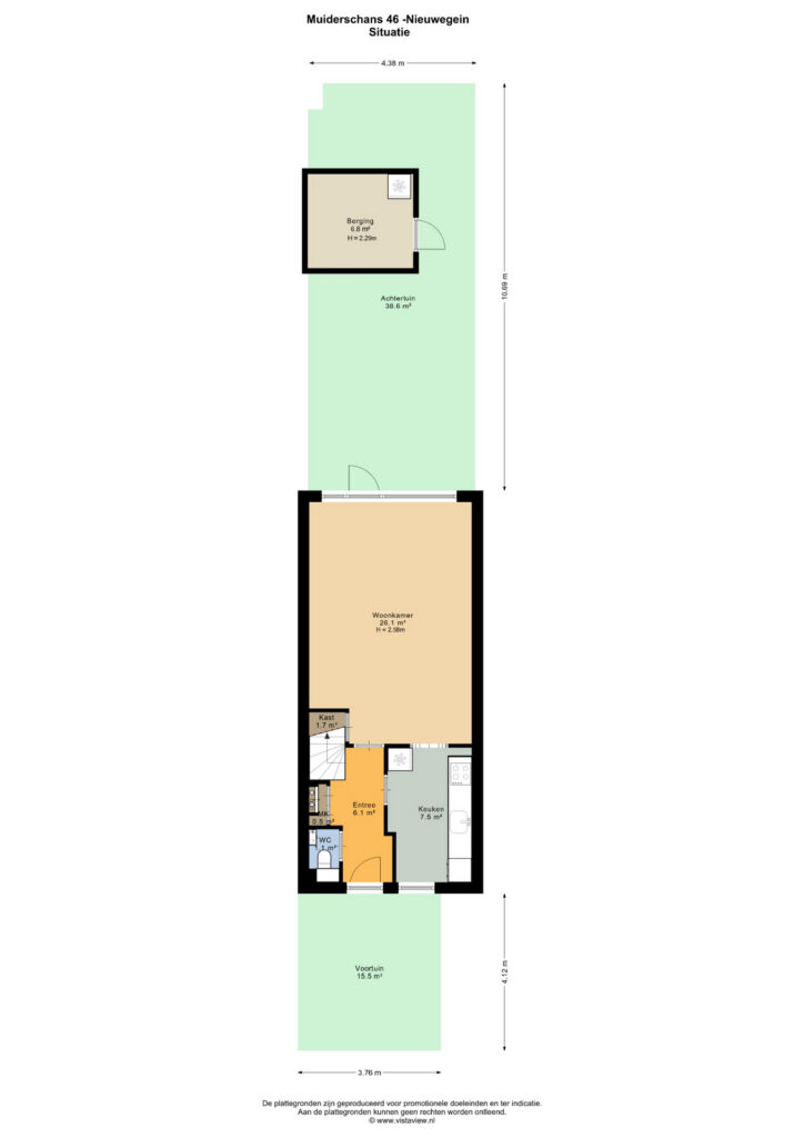 De tuin is circa 48 m² groot, voorzien van achterom en stenen berging. De opzet van de wijk is ruim: achter de tuin bevindt zich een plein en er zijn parkeerplaatsen (gratis parkeren).