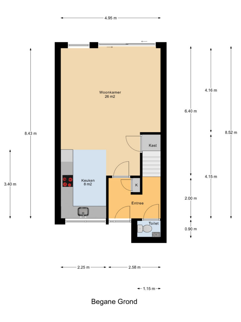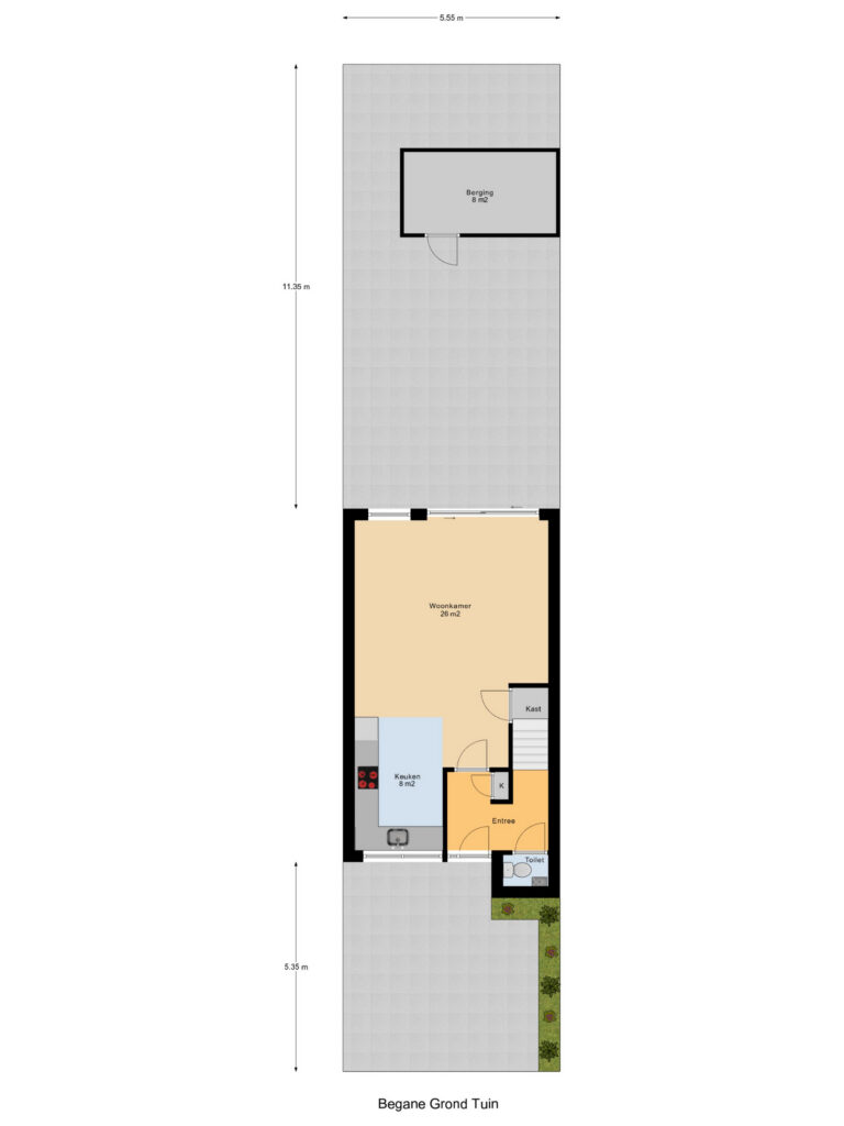 Entree, toilet en meterkast. Toegang naar de woonkamer van circa 26 m² groot. De open keuken ligt aan de voorzijde van de woning en is circa 8 m² groot. De moderne keuken is in L-vorm en donker van kleurstelling. Er zijn grote raampartijen in de keuken voor natuurlijk daglicht. Ook kan het raam open. De begane grond is voorzien van vloerverwarming. De woonkamer is tuingericht en via de schuifpui bereik je de tuin. Deze is gelegen op het oosten en circa 60 m² groot. Er is een stenen berging aanwezig en een achterom.