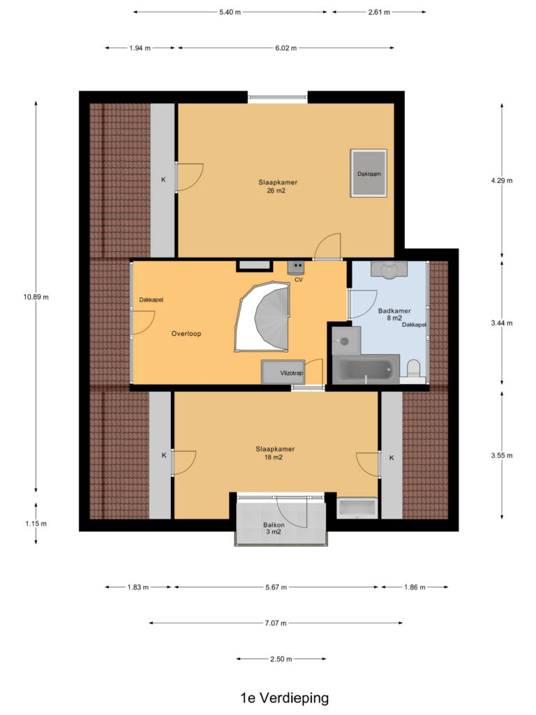 De ruime overloop met dakkapel biedt de mogelijkheid om eenvoudig een extra kamer te realiseren. Op deze verdieping bevinden zich twee royale slaapkamers van circa 26 en 18 m², waarvan één met balkon. Daarnaast is er een tweede badkamer (ca. 8 m²), voorzien van een ligbad, douche, wastafel en toilet.
