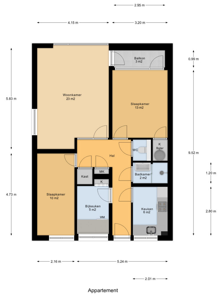 De lichte woonkamer 23 m² is het hart van het appartement. Dankzij de grote ramen valt er volop daglicht naar binnen, wat zorgt voor een prettige sfeer. Vanuit de woonkamer bereik je het balkon dat op het westen ligt – hier kun je heerlijk genieten van de middag- en avondzon.