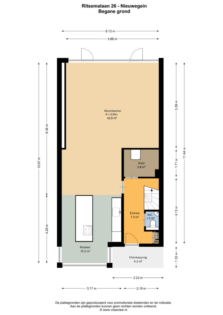 Entree, hal, toilet en trapopgang naar de verdieping, evenals een ruime inpandige berging/bijkeuken. De woonkamer is op de tuin gericht, op fraaie wijze uitgebouwd en voorzien van openslaande deuren. De keuken bevindt zich aan de voorzijde van de woning en is eveneens uitgebouwd. De ruimte is smaakvol vergroot door middel van een erker. Het vele glas zorgt voor een prachtige lichtinval. Met een slim systeem van plisségordijnen is de mate van privacy in de keuken perfect te regelen.