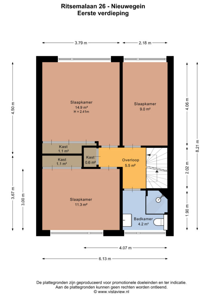 Overloop, drie slaapkamers van respectievelijk 9, 15 en 11 m². De twee grootste kamers beschikken over vaste kasten. Ook op de overloop bevindt zich een praktische vaste kast. De badkamer is voorzien van een inloopdouche, wastafelmeubel en een tweede toilet.