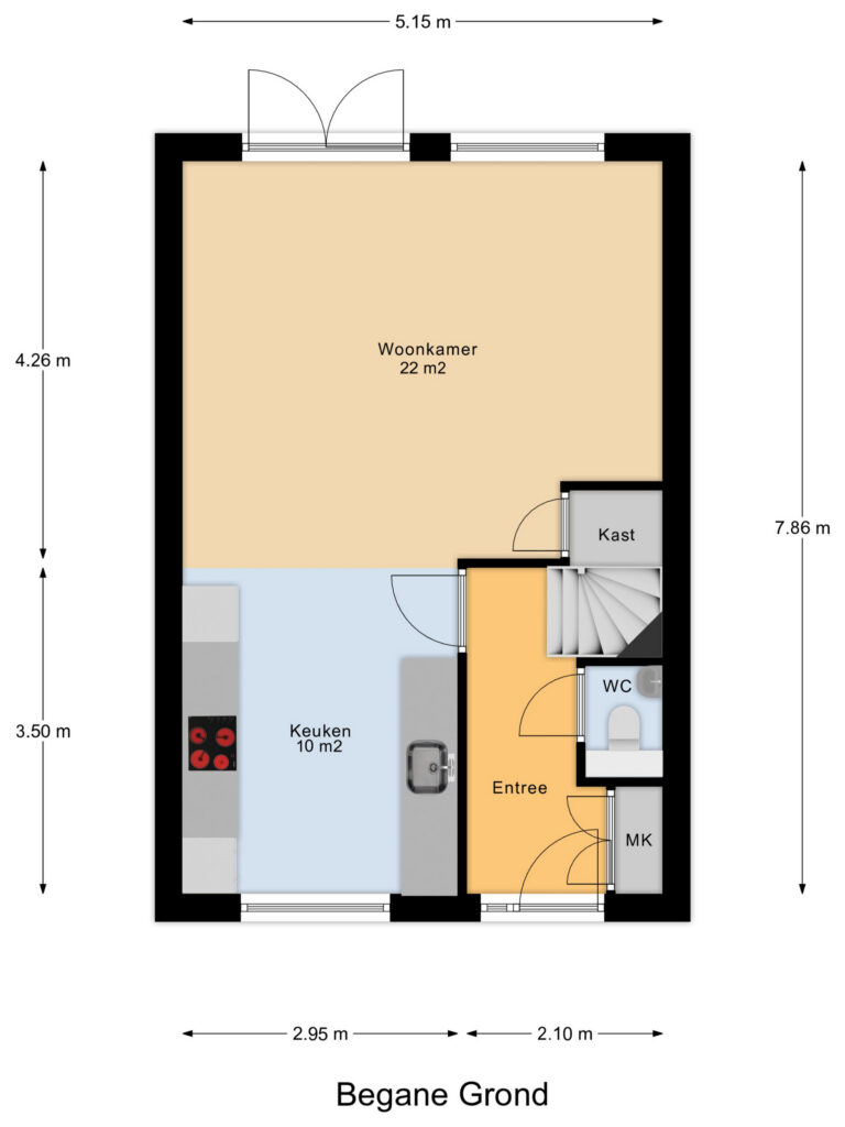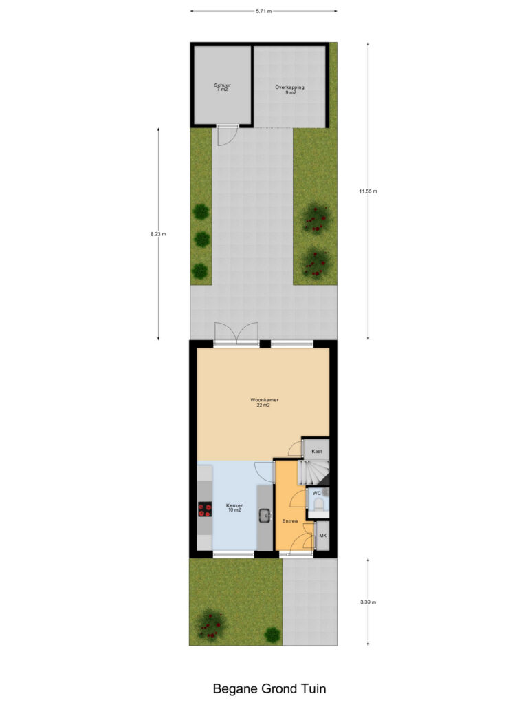 Entree, meterkast, toilet en trapopgang. toegang naar de woonkamer. De woonkamer is licht door de grote ramen en heeft over de hele breedte zicht op de tuin De luxe keuken is aan de voorzijde van de woning gesitueerd. De keuken beschikt over alle wenselijke inbouwapparatuur. De tuin is bereikbaar via openslaande deuren.
