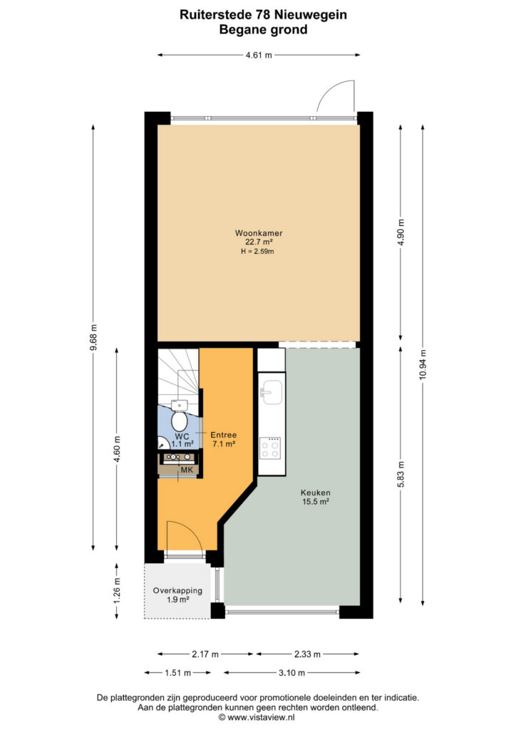 Via de entree kom je binnen in de hal met de meterkast, toilet en trapopgang naar de eerste verdieping. Vanuit de hal stap je de lichte woonkamer (ca. 23 m²) binnen, die een prettig uitzicht biedt op de achtertuin. De woonkamer vormt samen met de ruime keuken (ca. 15,5 m²) een fijne leefruimte waar gezelligheid centraal staat.