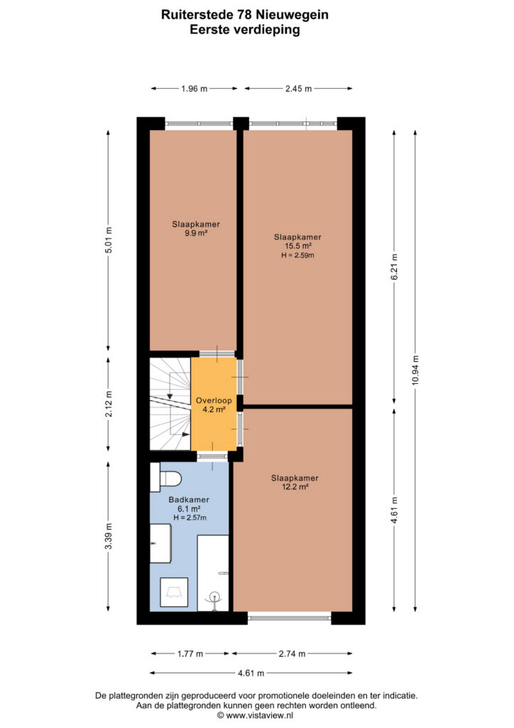 Op de eerste verdieping bevinden zich drie ruime slaapkamers van respectievelijk 10 m², 15,5 m² en 12,2 m². De badkamer (ca. 6,1 m²) is compleet ingericht met een douche in ligbad, wastafel, tweede toilet en aansluiting voor de wasmachine. Een praktische en verzorgde verdieping waar iedereen zijn eigen plekje vindt.