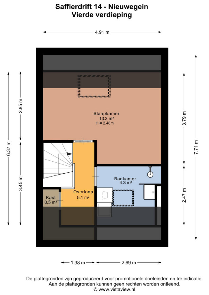Op de bovenverdieping kom je via de overloop in de ruime slaapkamer, eveneens met laminaat. Er is genoeg plek voor een tweepersoonsbed en kastruimte. De badkamer ligt naast de slaapkamer en is functioneel uitgerust met een douche, wastafel, designradiator en de aansluiting voor de wasmachine.