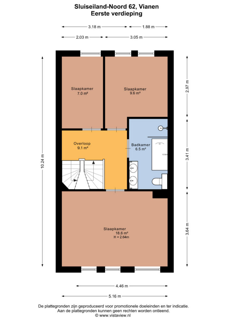 De ruime, L-vormige overloop geeft toegang tot drie goed bemeten slaapkamers van ca. 19, 10 en 7 m². De hoofdslaapkamer aan de voorzijde is licht en ruim, voorzien van een vaste kastenwand en met een prachtig uitzicht richting het water en de historische binnenstad van Vianen. De twee slaapkamers aan de achterzijde bieden een vrij zicht op het Merwedekanaal en de groenstrook, wat rust en privacy garandeert.