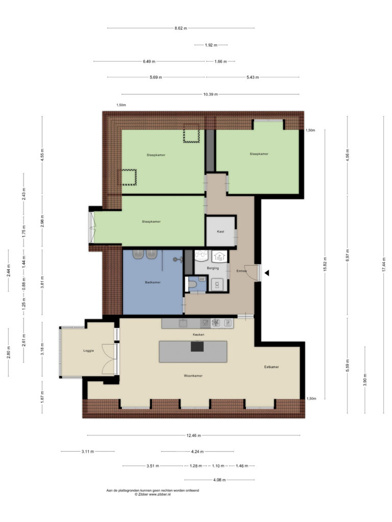 Het appartement beschikt over drie ruime slaapkamers van respectievelijk ca. 18,6 m², 18,5 m² en 18,2 m². De huidige indeling voorziet in een master bedroom met dressoir, een werkkamer met Frans balkon en een inloopkast met inbouwkasten.