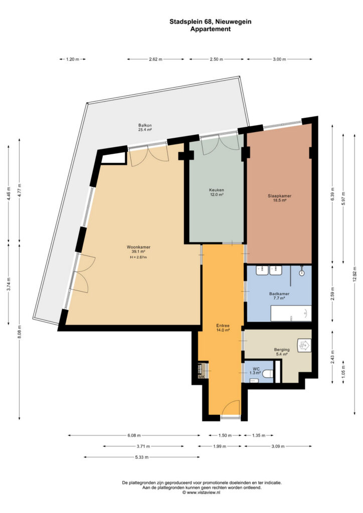 De indeling is erg aantrekkelijk: de woonkamer is ruim en de twee slaapkamers hebben ook een fors formaat. Omdat het appartement op de hoek is gelegen heeft het een prachtige lichtinval, ramen aan twee zijden en dubbele openslaande deuren naar het royale balkon (ruim 25 m²!). De hoogte van alle ruimtes geeft een extra prettige ruimtebeleving.