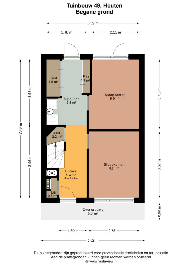 Nadat je de auto voor de deur op de eigen oprit hebt geparkeerd loop je via de voordeur de woning binnen. Direct links van de entree bevindt zich de meterkast. Naast de meterkast tref je de trapopgang naar de eerste verdieping en tegenover deze opgang vind je de eerste slaapkamer van de woning, welke oorspronkelijk een garage was. Vervolgens tref je de bijkeuken met de opstelling voor wasmachine en droger met een fraaie wastafel. Hier tref je de tweede slaapkamer van de woning. Vanuit deze slaapkamer of de bijkeuken bereik je de achtertuin.
