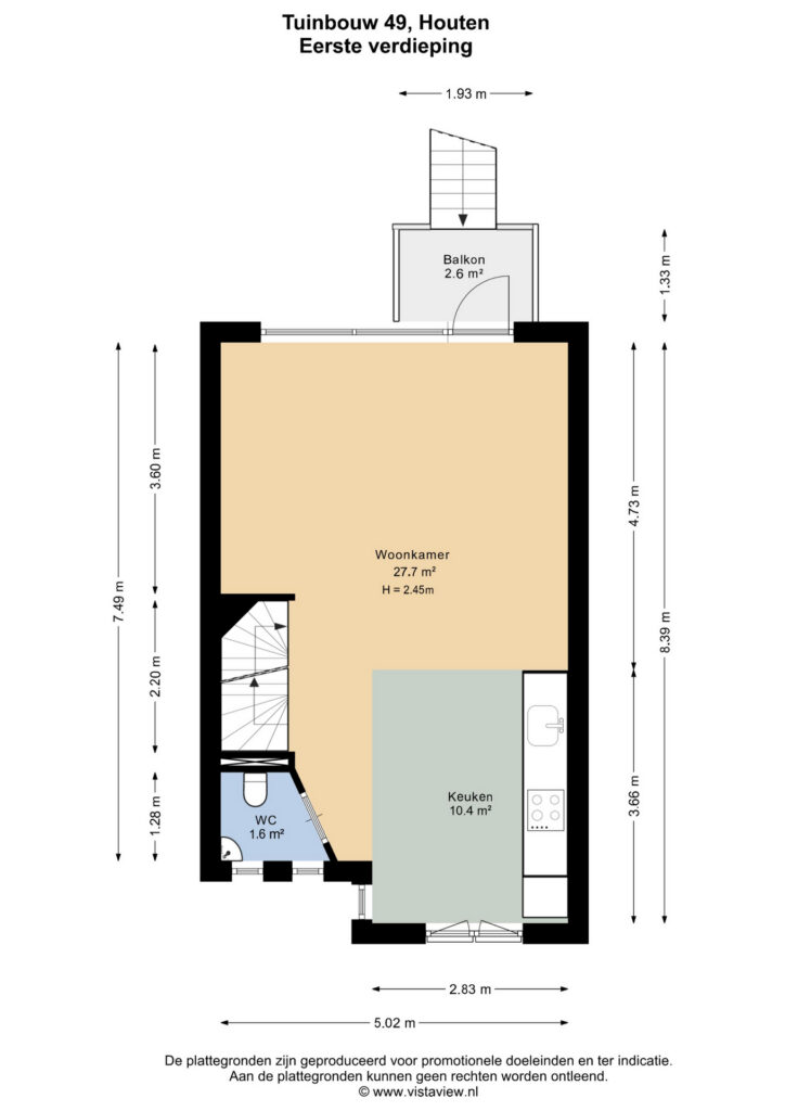The first floor is accessible via a small balcony and staircase from the backyard, or via the internal stairs from the entrance hall. Here, you step directly into the open-plan living room. The space is filled with natural light, thanks to full-width windows at the rear and French doors at the front. The kitchen is neat and fully equipped with built-in appliances. The sloping walls create a cozy dining area. Adjacent to the staircase is the tiled toilet room, featuring a wall-mounted toilet and hand basin.