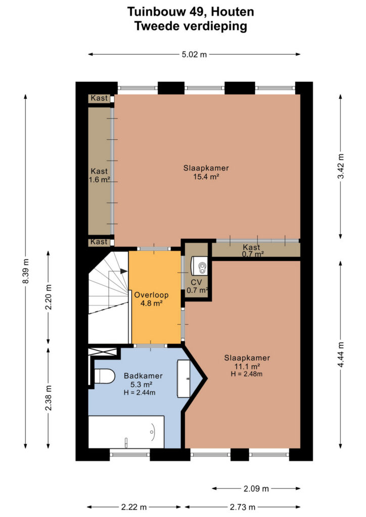 Middels de trapopgang lopen we door naar de tweede overloop van de tweede verdieping. Hier treffen we de overige twee ruime slaapkamers. De grootste slaapkamer beschikt over twee ingebouwde kasten en airco. Verder vinden we hier een separate ruimte waar zich de WTW-installatie bevindt. De moderne badkamer beschikt over een ligbad, douche, mooie waskom met wastafelmeubel en een tweede hangend toilet.