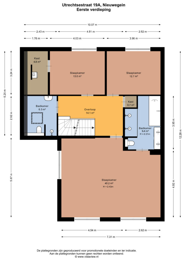 One of the 13 m² bedrooms has a spacious walk-in closet that also houses the central heating boiler.
