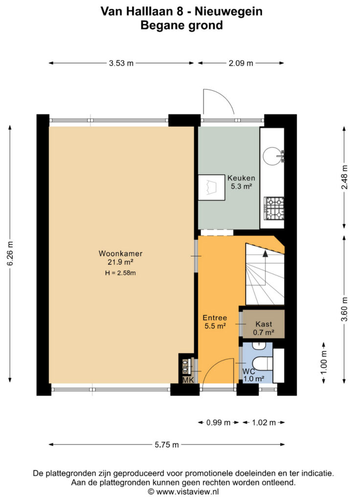 Entree, hal, toilet, meterkast en trapopgang. De keuken is gesloten ten opzichte van de woonkamer en is circa 5 m² groot. De woonkamer is circa 22 m² groot en is voorzien van grote raampartijen. Via de keuken bereik je de tuin, welke heerlijk ruim is én zonnig gelegen is op het westen! Er is een handige stenen berging achterin de tuin van 11 m² groot.