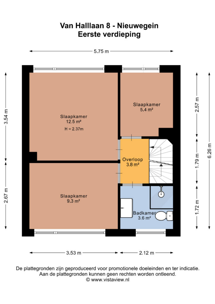 Overloop, drie slaapkamers van respectievelijk 12, 9 en 5 m². De badkamer is circa 4 m² groot en heeft een douche, tweede toilet en een wastafel.