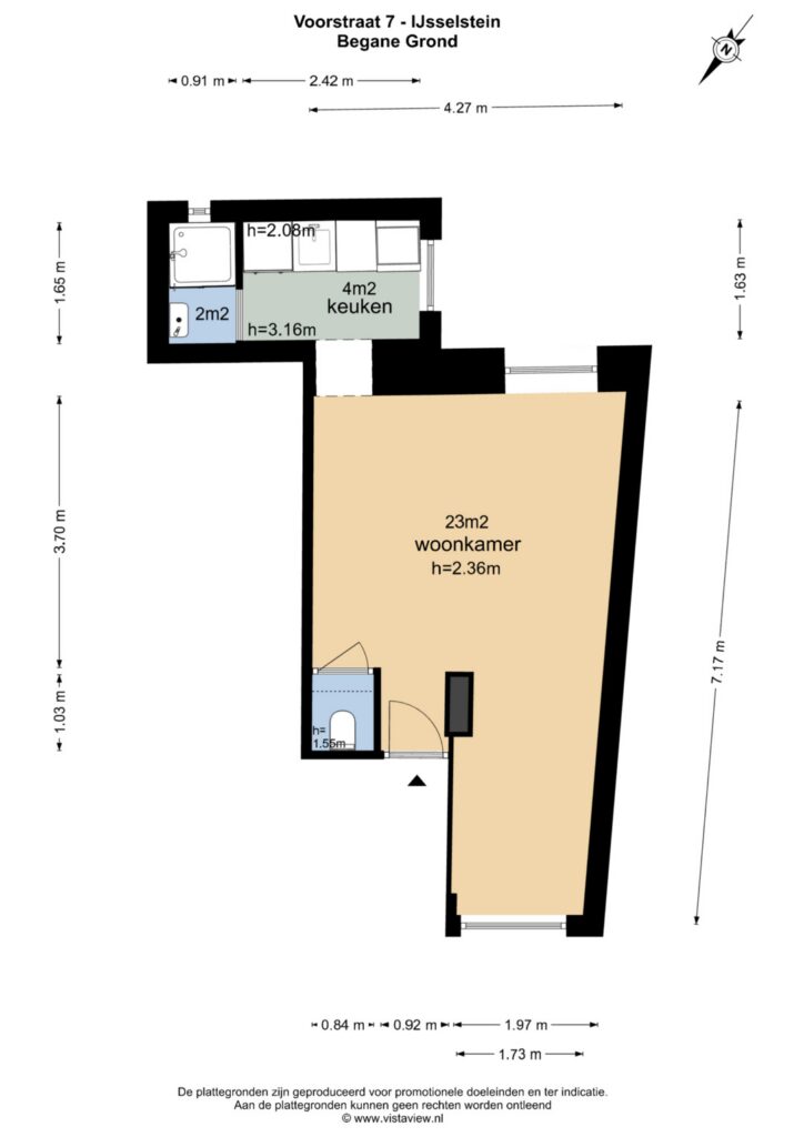 De deur in de hal geeft toegang tot de eigen studio; de woon/slaapkamer van ca. 23 m² biedt voldoende mogelijkheden om aan de voorzijde een slaapplek te realiseren. Vanuit het woongedeelte kamer is er toegang tot het moderne toilet en de afgesloten, lichte keuken