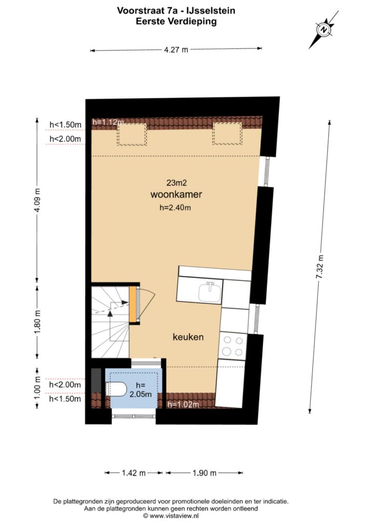Daarnaast is er een separaat toilet aanwezig. De woonkamer van ca. 23 m² is licht en aangenaam, vanuit de woonkamer leidt een trap naar de bovenliggende verdieping. Op deze verdieping bevinden zich: een slaapkamer en een moderne badkamer voorzien van douche, wastafel en wastafelmeubel.
