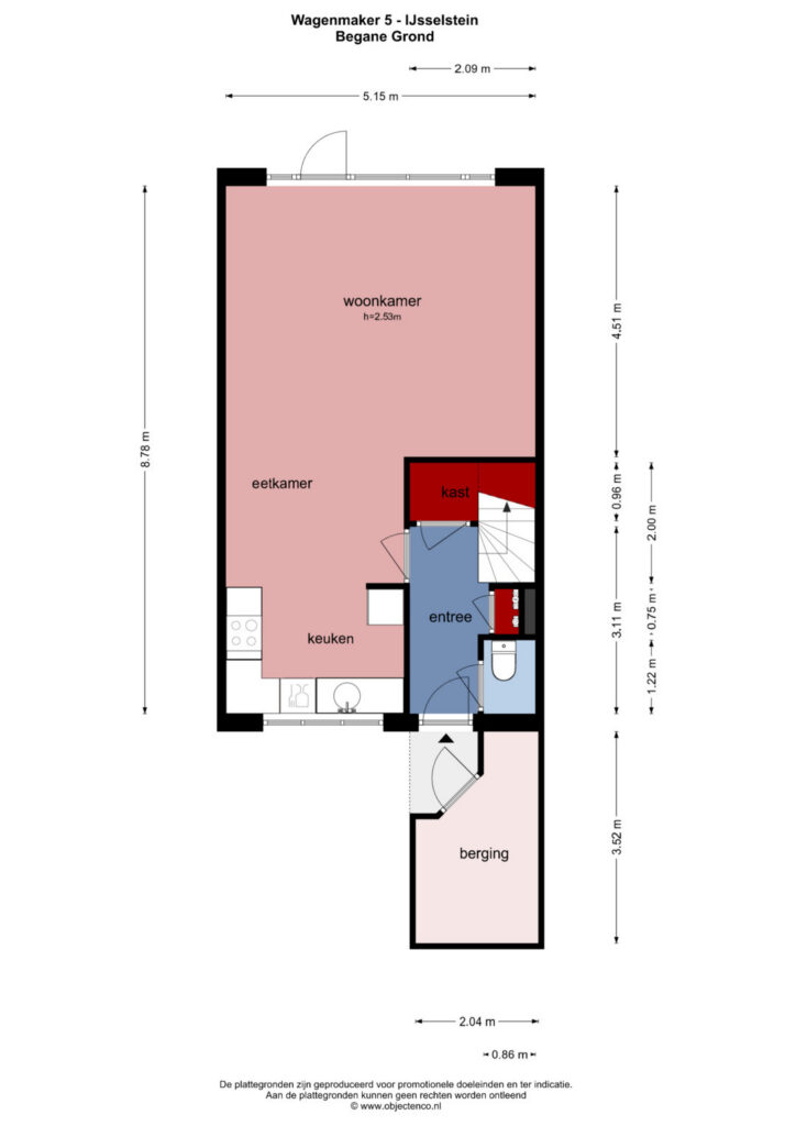 Hal, toilet, meterkast en ruime trapkast, woonkamer en keuken. De woonkamer is, samen met de keuken 36 m² groot en op de tuin gericht. De luxe keuken is aan de voorzijde van de woning in een ruime L-opstelling geplaatst. De keuken beschikt over alle wenselijke inbouwapparatuur.