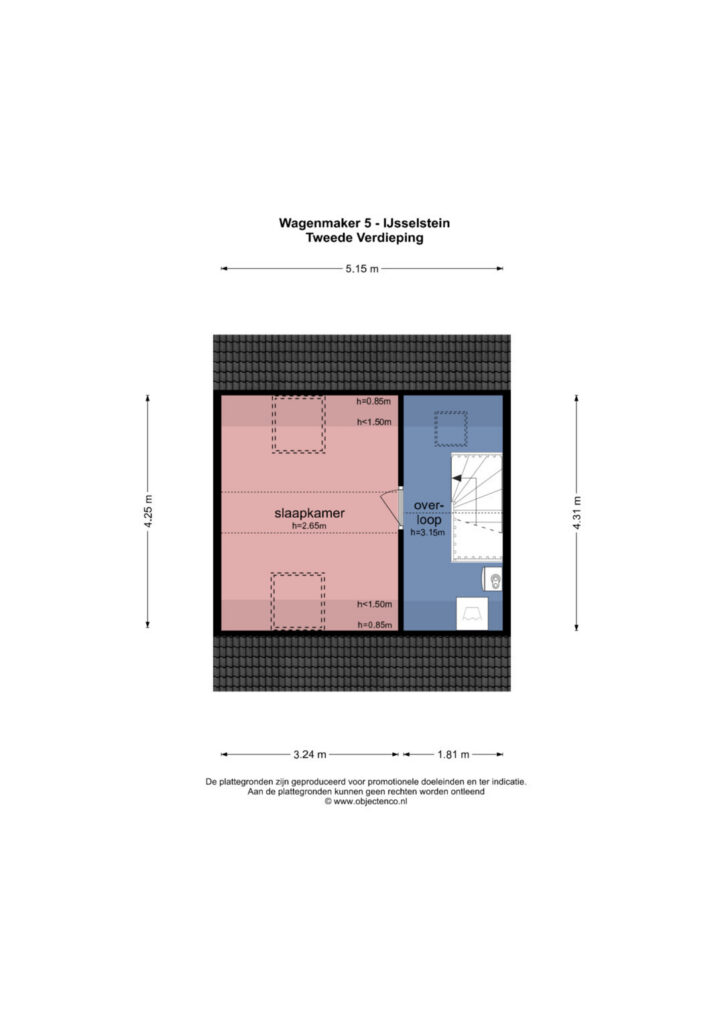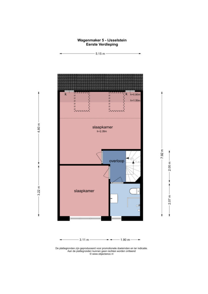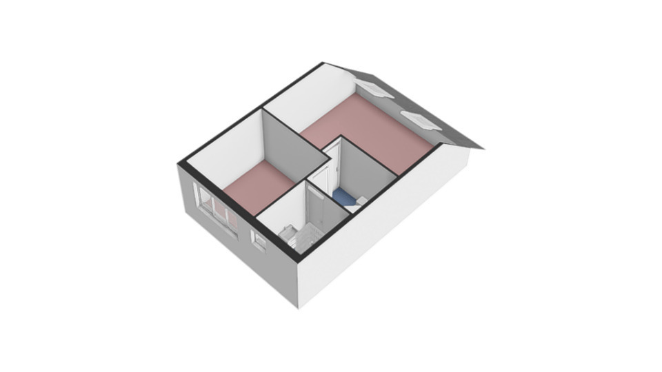 Voorzolder met de wasmachine-aansluiting en de opstelplek van de CV-ketel. Slaapkamer van 14 m² met aan beide zijden een dakraam.
