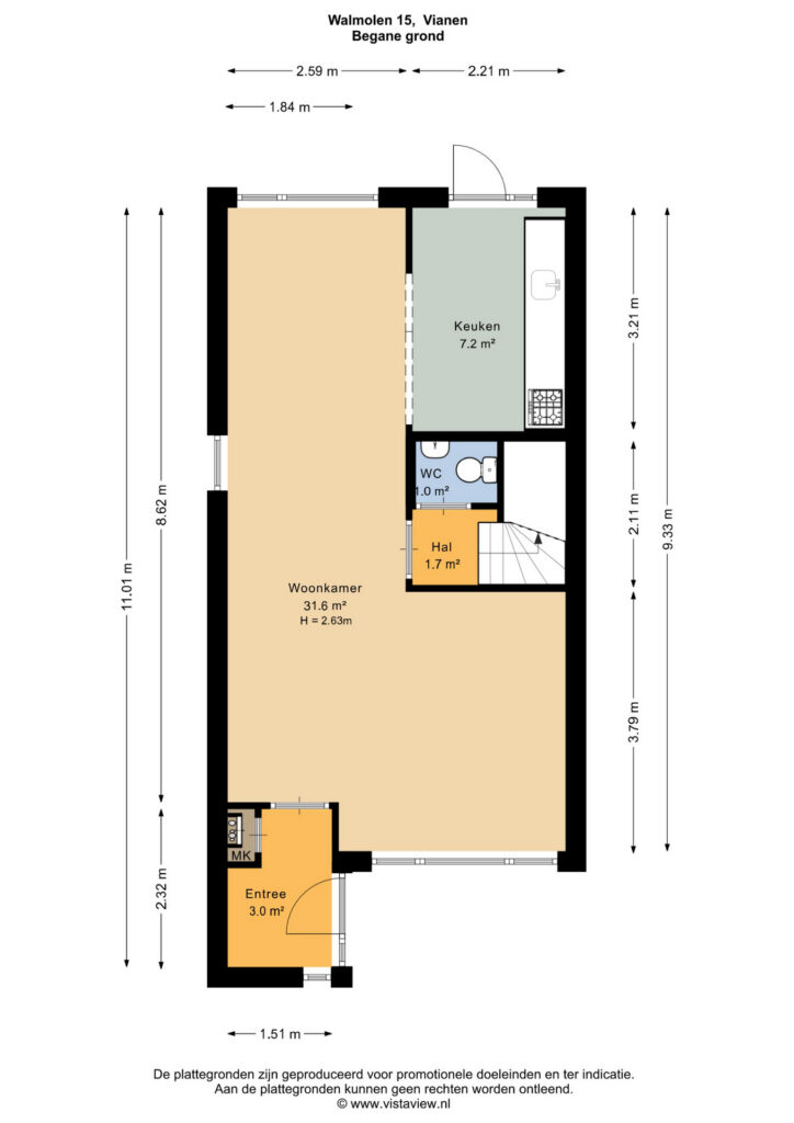 Via de uitgebouwde entree kom je binnen in een hal met meterkast en garderobe. De L-vormige woonkamer van circa 32 m² is licht en functioneel ingedeeld, met ruimte voor een zithoek aan de voorzijde en een standaard half open keuken van circa 7 m² aan de achterzijde. Vanuit de keuken geef je direct toegang tot de achtertuin via een openslaande deur, wat de verbinding tussen binnen en buiten prettig maakt. Via de tussenhal bereik je het toilet en de vaste trap naar de verdieping.