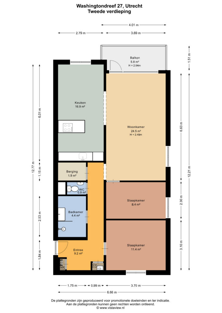 Entree appartement, hal met meterkast en een vaste kast waar zich de CV-ketel bevindt. Direct rechts is de een van de slaapkamers te vinden, deze is ruim 11 m² en kijkt uit op de galerij. Weer terug in de hal vind je aan je linkerhand de badkamer. Deze is voorzien van inloopdouche en een wastafel met meubel. Naast de badkamer is het separaat toilet met fonteintje. Aan het einde van de hal, naast het toilet, is een inpandige berging en toegang tot de woonkamer.